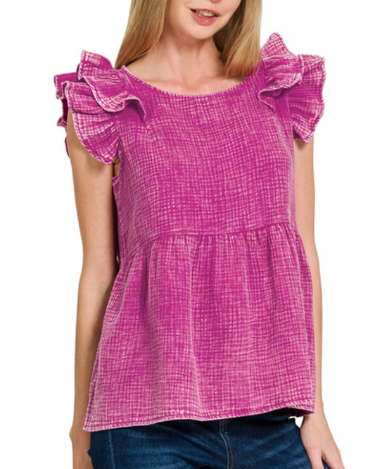 Ash Pink - Gauze Acid Washed Tiered Ruffle Peplum Top (Copy)
